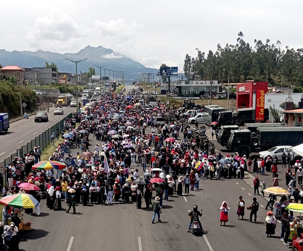 Una marcha convocada por la Unión de Organizaciones Indígenas y Campesinas de Cotacachi (UNORCAC) terminó en un nuevo enfrentamiento con la Policía Nacional, este jueves en Ilumán, al norte de Otavalo. En medio de un ambiente tenso, una mujer policía resultó herida tras recibir una pedrada en la cabeza, lo que desató una fuerte reacción de los uniformados. El hecho ocurrió pasado el mediodía del jueves 23 de octubre de 2025, durante una concentración que reunió a unas 2 mil personas. De acuerdo con información policial, un grupo de personas que llegó desde Cotacachi comenzó a lanzar piedras. Ellos respondieron con gases lacrimógenos. La tensión escaló rápidamente y derivó en la retención de otros dos policías, que también resultaron heridos. Para ser liberados fueron obligados a pedir disculpas públicas. Cuando los ánimos se calmaron, los asistentes realizaron rituales ancestrales y ofrecieron una misa en memoria de Efraín Fuérez, la primera víctima del paro en Imbabura. A las 14 horas, iniciaron un recorrido de unos 5 kilómetros por la panamericana hasta el Parque de los Dinosaurios de Otavalo. En ese lugar José Guamán, recibió un impacto de bala en el pecho el pasado 14 de octubre, que horas más tarde terminó con su vida. Bajo una intensa lluvia, los asistentes también le rindieron tributo al comunero oriundo de la comunidad de Cachiviro, con rituales y emotivos discursos. Pero los homenajes a las víctimas se empañaron por los hechos violentos, que fueron recurrentes en este paro indígena, el más largo en la historia de Ecuador, que se prolongó 31 días.
