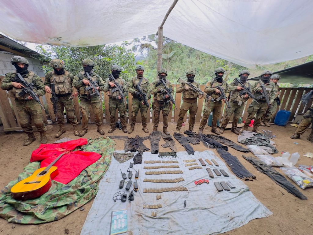 En el campamento intervenido se incautaron municiones de distintos calibres, alimentadoras para fusiles, radios de comunicación, documentos doctrinarios, medicinas y abastecimiento logístico para varias semanas. También se encontraron prendas con distintivos del grupo armado.