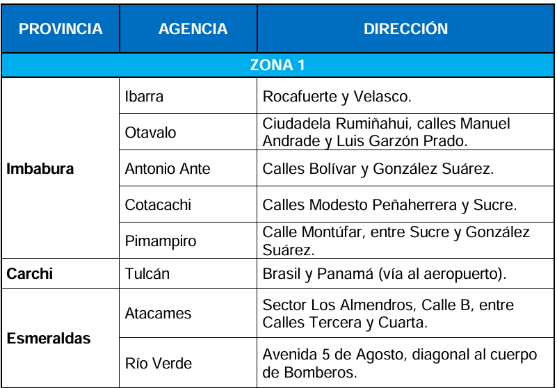 En Imbabura estarán operativas las agencias de Ibarra, Otavalo, Antonio Ante, Cotacachi y Pimampiro, mientras que en la zona norte también funcionarán las oficinas de Tulcán (Carchi); Rioverde y Atacames (Esmeraldas).